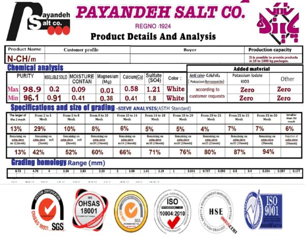 این محصول  در شرکت نمک پاینده اولین سایز تولید شده از خروجی چکش شماره 1 کارخانه بوده است